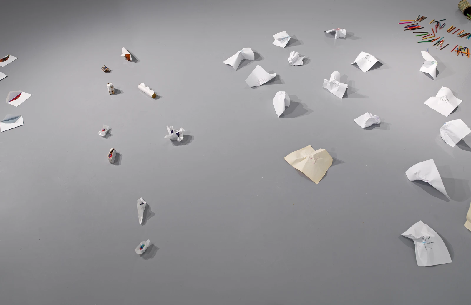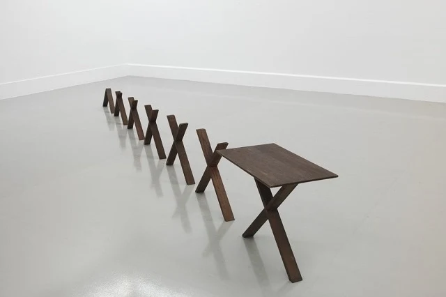 Örneğin sergi alanında bir nizama göre dizilmiş yalın sehpaları peşi sıra görünce, önce boşluğun içinde öylece duran hacimlerine çekilir dikkatimiz. Ve tabii ki bir suali peşinde getirir: Ne var burada? Burda bişi var ama ne?